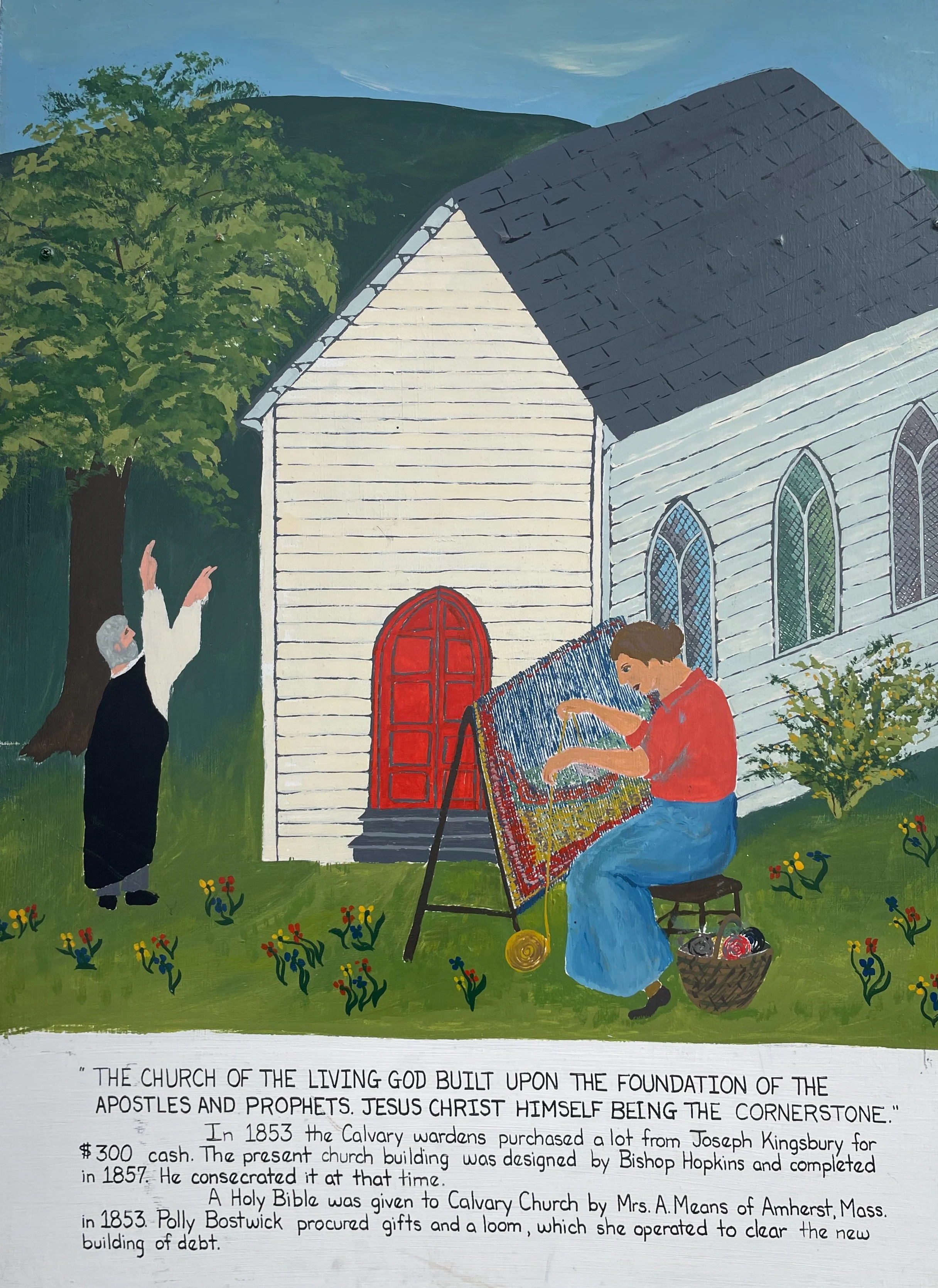 Shown here are two from a series of six painted panels depicting the history of Calvary Episcopal Church. Designed by artist Lucy Yarian and painted by Rebecca Yarian, Karen Lyon, and Margaret Connelly with lettering by Susan Nöel. All six of the paintings can be seen in the church hall. Made in 1982. You are welcome to come see them!